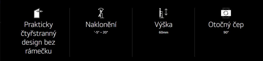 Prakticky bezrámečkový design ze čtyř stran zvyšuje pocit ponoření do obrazu, zatímco tenký a minimalistický stojan ve tvaru L udržuje pracovní prostor čistý a přehledný. Design, který je propracovaný ze všech úhlů, kombinuje vizuální čistotu s ergonomickou flexibilitou. Obrazovku lze naklánět, otáčet a nastavovat její výšku a otočit o 90° v obou směrech do režimu na výšku, což je vhodné pro prohlížení dlouhých dokumentů, programování nebo procházení webu.
